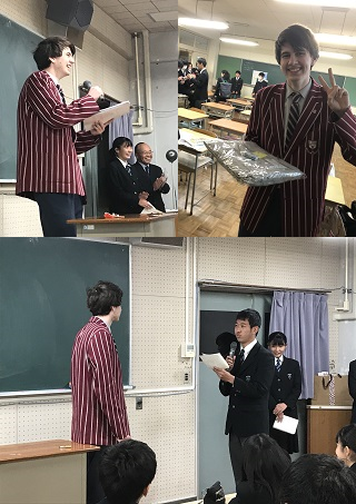 11月25日より本校で一緒に学んでいる留学生のHamish Long君ですが1月17日をもって留学期間が終了となります。昨日は所属している高校1年部で送別会を開きました。ヘミシュ君はなんと日本語でスピーチをしてくれました。彼にとって清水南高校での経験はとても充実したものであったようで、様々な思い出を一生懸命日本語で伝えてくれました。学年の代表生徒として、13HRでいつも彼の隣の席に座り、おそらく最も多くの時間をすごしたであろう生徒が英語でメッセージを送りました。国にとらわれない、国際的な友情が結ばれたことに深く感銘を受けました。以下はヘミシュ君からのメッセージです。