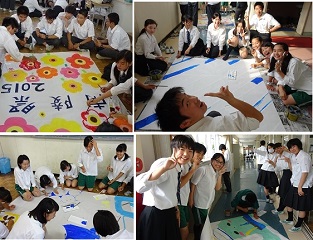いよいよ明日から南陵祭です。今日は校内の展示装飾の準備が午後から行われました。高校1年の普通科3クラスは、階段装飾を行います。LHRを活用してクラスで描いた作品を短冊にカットして、階段に装飾します。一般公開の6/13には、是非、階段装飾にも注目してください。
