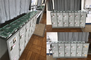 本校には、学年ごとにアトリエがあり、学年が上がるごとに、アトリエを移動します。そんなことからロッカーの名札は移動可能なマグネットとなっています。色は学年色を使い、一目で学年がわかる様になっています。