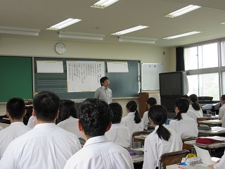 静岡県高等学校音楽教育研究会第2回研究授業が本校にて開催され、県内から約25名の先生方が来校されました。授業集団は13・14HR「音楽Ⅰ」選択者、題材は「歌いから謡(弱吟)にチャレンジ」。皆、能「羽衣」キリの謡に初挑戦しました。