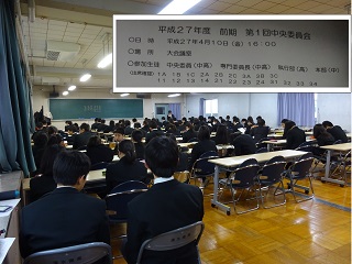執行部(高)、中等部本部、専門委員長(中高)、各クラス中央委員、合わせて約50名の大きな会議です。